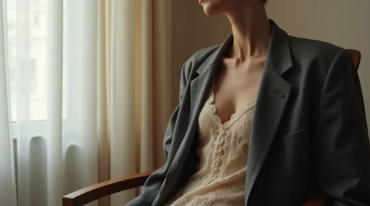 Porter une nuisette de qualité sous un blazer structuré crée un contraste sophistiqué entre la fluidité sensuelle du tissu et la rigueur de la veste. Cette alliance fonctionne particulièrement avec les matières nobles : la soie, le satin de soie ou la viscose haut de gamme tombent impeccablement et ne créent pas de volume indésirable. La qualité de la dentelle devient déterminante : les versions bas de gamme, rigides et synthétiques, trahissent immédiatement leur origine lingerie, tandis qu’une dentelle Leavers fine et souple se fond naturellement dans la tenue.